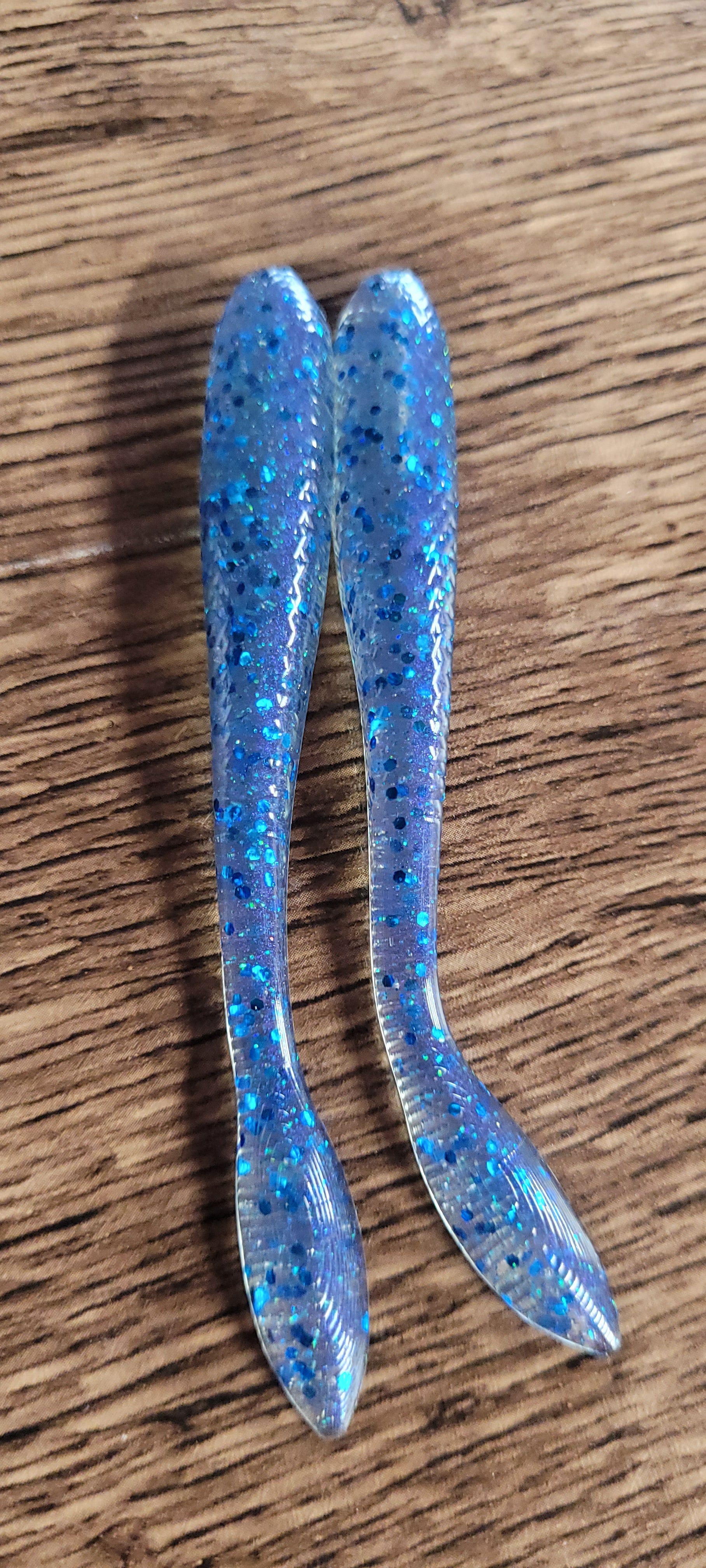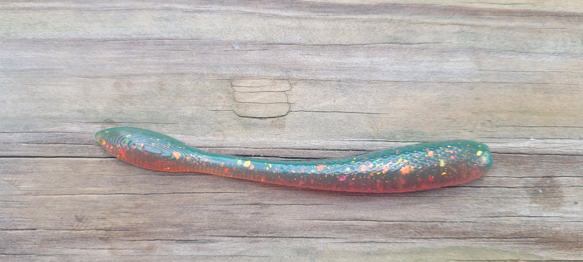 This is a flat bottom worm. Versatile and robust. The larger head is a good match for most hooks. It thins down before transitioning to a bulb tail, bringing motion and tantalizing action to the rear. Goes great on a skirted swim or arky jig. More than enough plastic for nose hooking on dropshot.